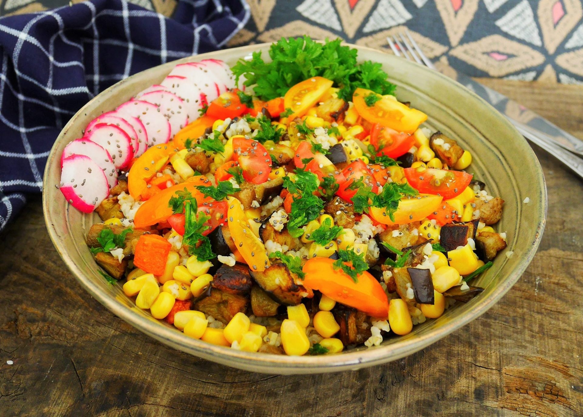 - Le mercredi :Coupez les deux tiers des tomates cerise en deux, les radis en rondelles (gardez 5 à 6 radis pour les tartinades) et ajoutez-les à la salade de boulgour aux légumes. Ajoutez également un peu d'oignon nouveaux coupé en petits morceaux. Arrosez avec la vinaigrette au persil, saupoudrez avec les graines de chia et ajoutez quelques amandes. Décorez avec un peu de persil haché grossièrement,