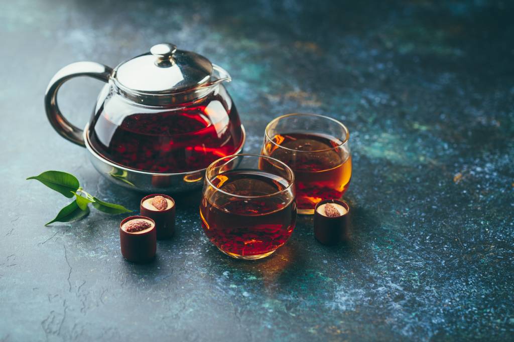 Le thé rouge a un goût délicatement épicé. Il s’agit d’un mélange de thé noir et de feuilles de rooibos. Il ne renferme pas de théine et contient peu de tanins. Par contre, il présente une quantité non négligeable de fer, de calcium, de zinc, de magnésium et de manganèse.