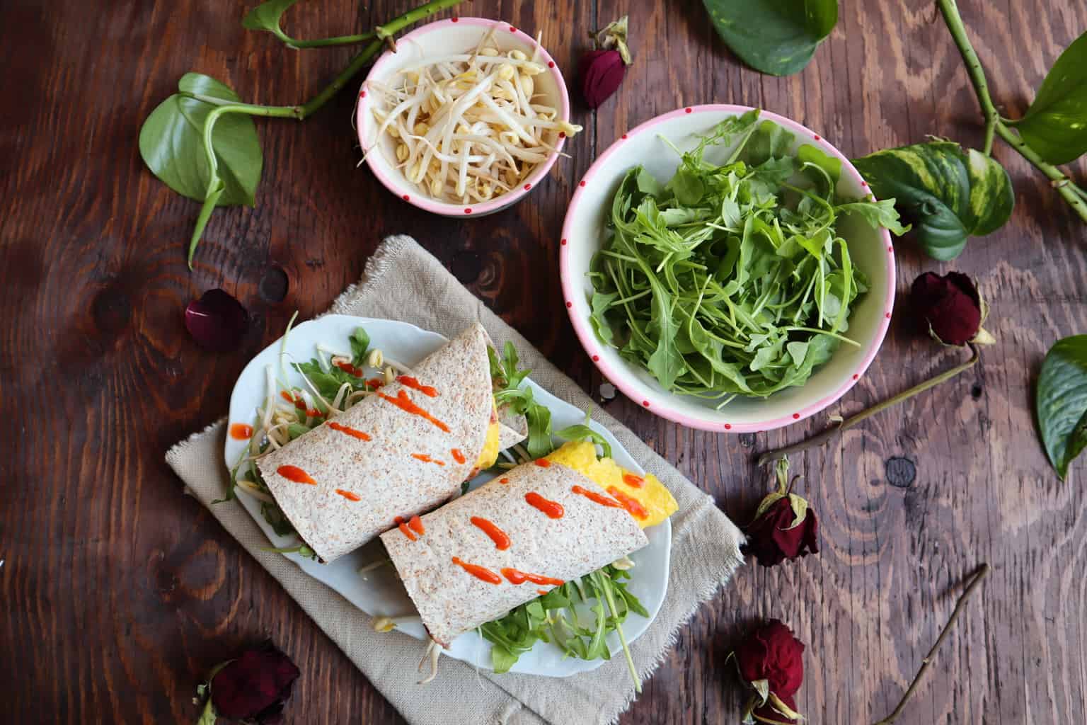 - Déjeuner : wrap au houmous de haricot rouge, graines germées et roquette.