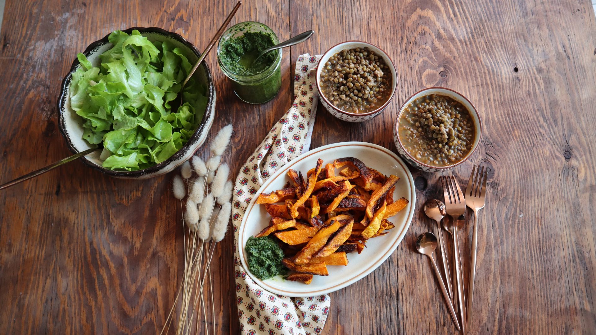 - Servez les frites de butternut accompagnées des lentilles et d'une sauce de votre choix. Cela peut être une mayonnaise, de la moutarde ou bien un pesto maison. Le mien, je l'ai préparé à base de fanes de carotte.