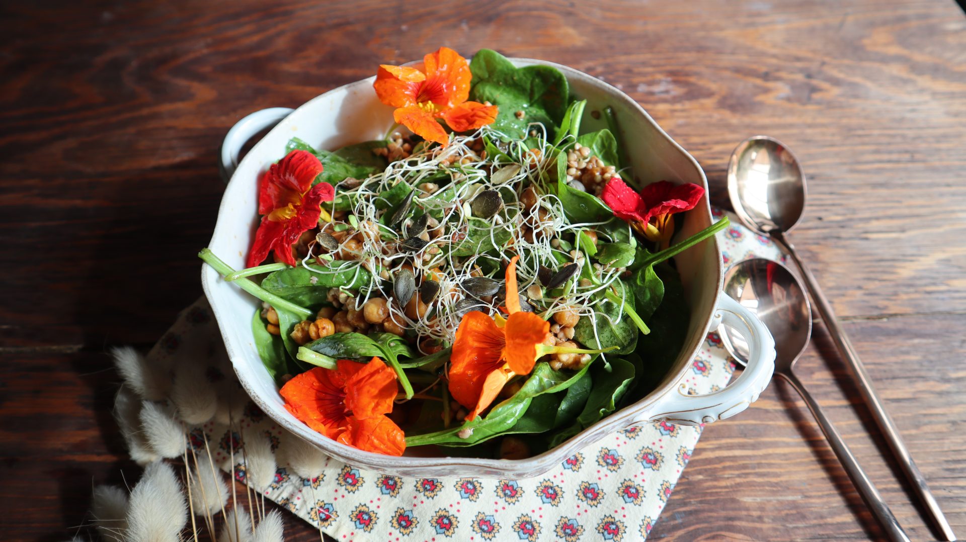 - Dans un grand saladier, mélangez ensemble les jeunes pousses d'épinards, le sarrasin, les pois chiches, les graines germées et les graines de courges,