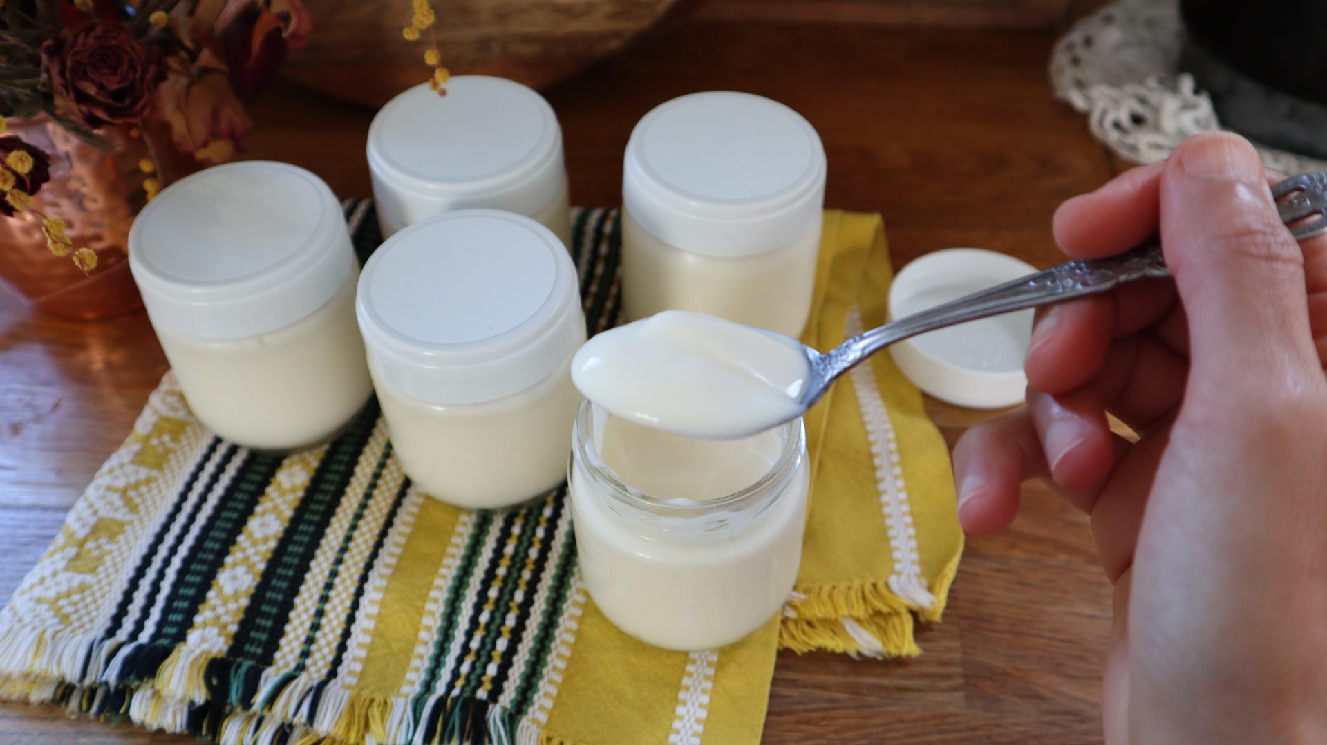 • 1 yaourt nature (comme ferment). Si vous souhaitez une texture plus ferme, utilisez à la place du yaourt un sachet de ferment lactique.
